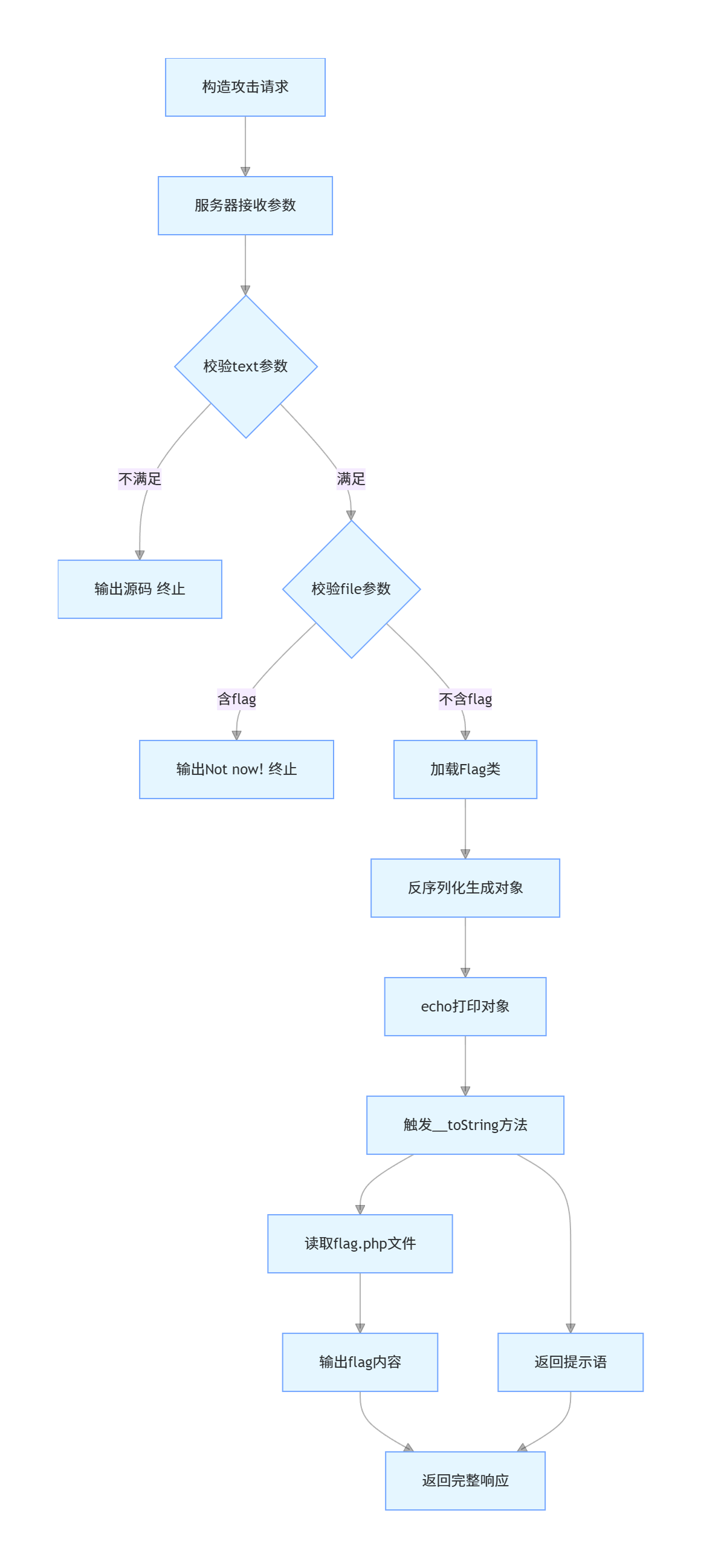 这里的Flag类用到了魔术方法__tostring,还用到了file_get_contents,并且属性$file是我们可控的,那这里我们就可以去构造一个属性$file等于flag.php,并且将它做序列化操作,并将序列化后的数据参数传递给password,(注意参数file需要包含useless.php)我们可以看到,在index里面,$password是会进行反序列化操作的,服务器将我们的反序列化的paylaod数据重新反序列化为一个对象,在之后,进行了echo $password操作,此时由于$password是对象,将对象当做字符串处理会自动触发Flag类里的__tostring魔术方法,从而导致执行echo file_get_contents($this->file);,而此时的$file属性已经是被我们修改后的flag.php,file_get_contents函数就会去执行文件读取操作,去读取flag.php的内容,从而输出flag