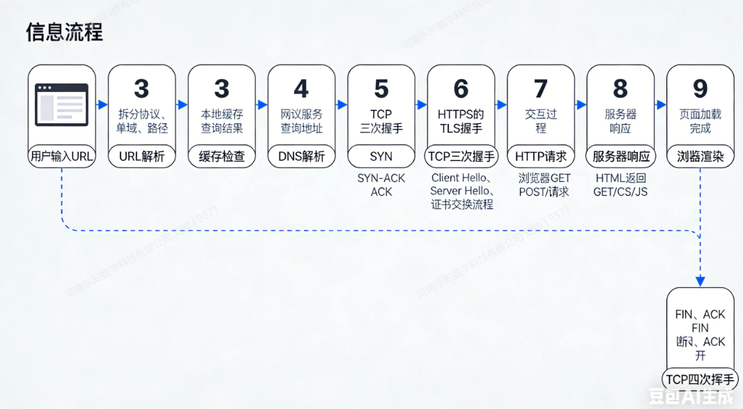 URL解析 --> 检查本地缓存 --> DNS域名解析 --> TCP连接 --> 浏览器发出请求 --> 服务器返回响应 --> 浏览器渲染页面 --> 满足条件后TCP断开连接