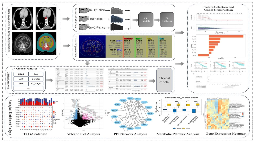 食管癌是全球第六大癌症相关死亡原因,其中食管鳞状细胞癌(ESCC) 是最常见的病理亚型,5年总生存率低于20% ,3年生存率多不足50% ,预后极差。目前,ESCC的预后评估主要依赖术后病理指标如TNM分期、分化程度和脉管侵犯等,但这些指标难以反映患者间的肿瘤生物学异质性 ,导致相同分期的患者生存差异显著。近年来,营养不良和低骨骼肌质量(LSMM) 被证实是ESCC等实体瘤的重要独立预后因素,但多数深度学习(DL)生存模型未整合此类宿主营养状态信息。另一方面,基于CT图像的深度学习特征(DLS)可非侵入性地捕获肿瘤形态与异质性 ,具备预后预测潜力。然而,现有DL模型多局限于影像特征,缺乏与转录组代谢异质性的关联分析,限制了其生物学可解释性和临床推广。因此,亟需构建融合影像、临床与营养指标的多模态模型,并探索其背后的分子机制。