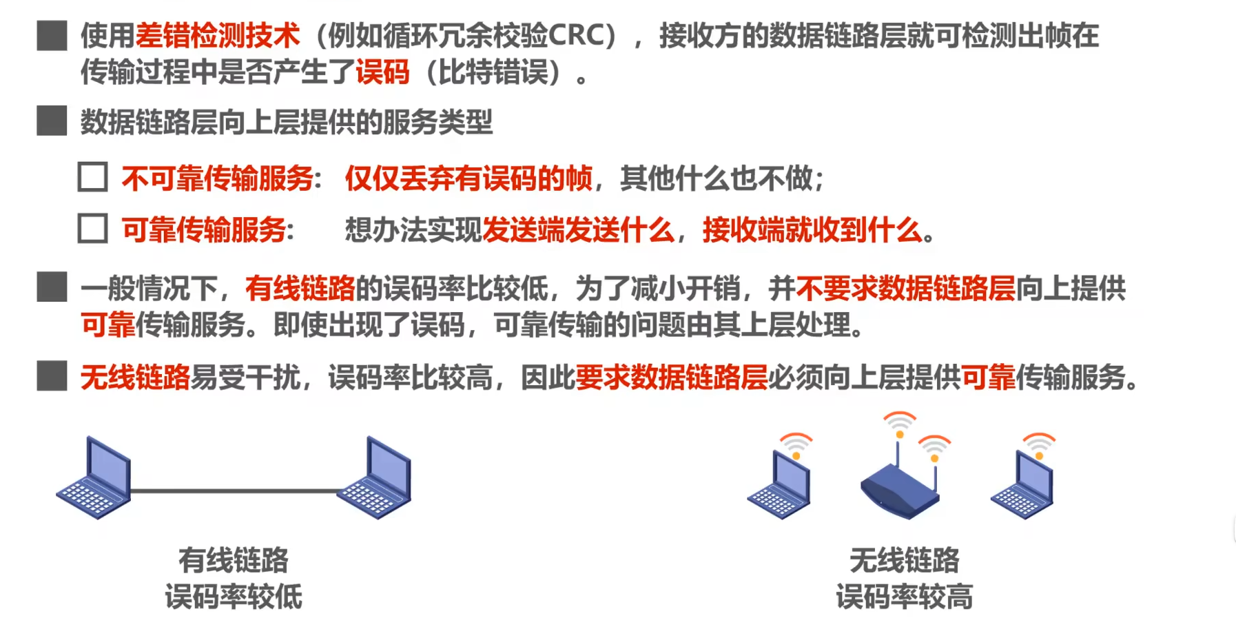 - 如果数据链路层向其上层提供的是可靠服务,那么就还需要其他措施来确保接收方主机还可以重新收到被丢弃的这个帧的正确副本