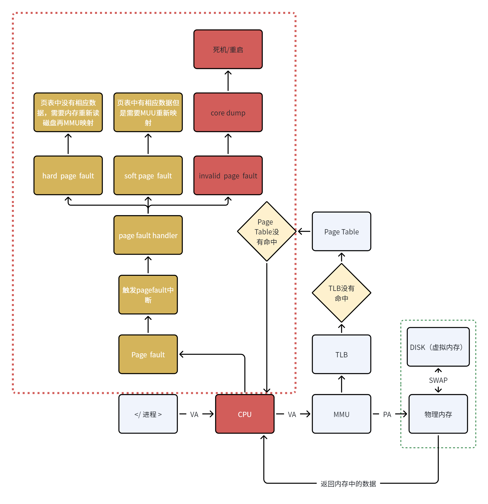 page fault如果发生有相当的概率会导致系统崩溃。缓存没有命中TLB或者Page table,称为page fault,缺页存在的整体流程及情况见图。