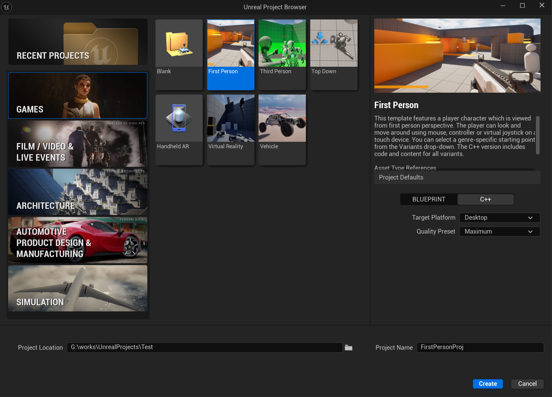 注意选择C++类型的工程项目,打开编辑器运行游戏即可体验对一个玩家的操控,具有跑跳等基本运动能力