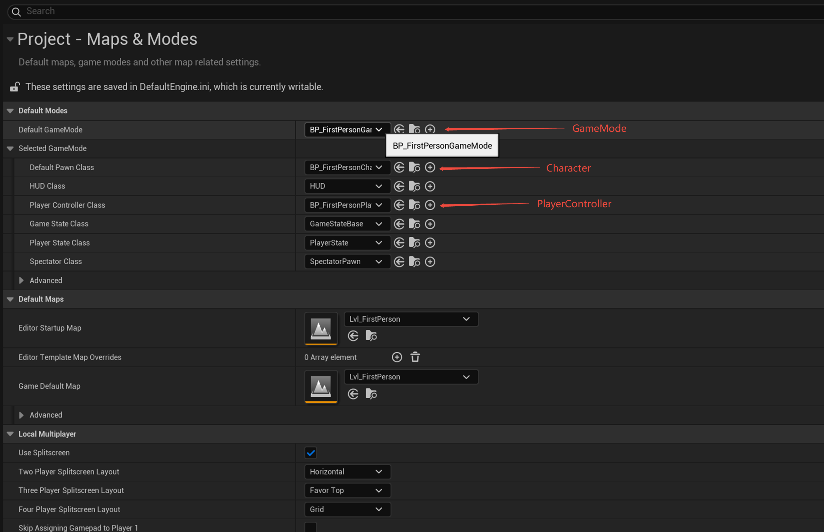 其中是GameMode,Character和PlayerController三个主要玩法类被替换为第一人称相关的玩法类