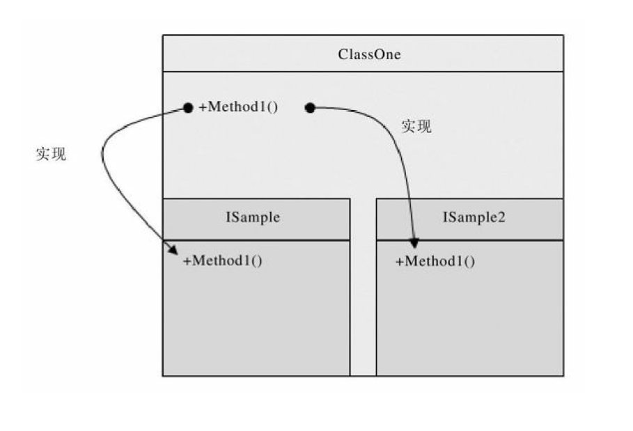 接下来,我们使用一个例子来说明。定义两个接口ISample和ISample2,它们都定义了方法Method1,两个方法的签名和返回值均相同。然后再定义一个类ClassOne,它实现了这两个接口,并在ClassOne类中提供了Method1方法的实现,如代码清单12-8所示。代码清单12-8 实现具有相同成员的接口
