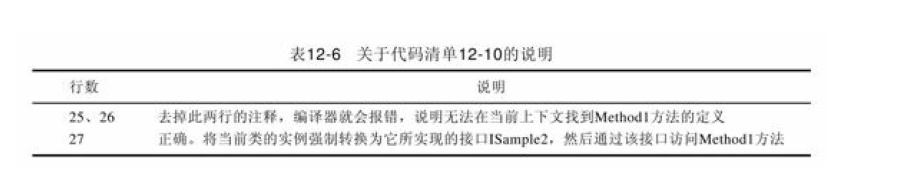 对于显式的接口成员实现,只能通过接口进行访问,除此以外都不能进行访问,即使在实现类中的其他方法也不能。我们以代码清单12-9为基础,尝试在实现类中定义一个新方法,然后在该方法中尝试访问显式定义的接口成员实现,如代码清单12-10所示。代码清单12-10 调用显式接口成员实现