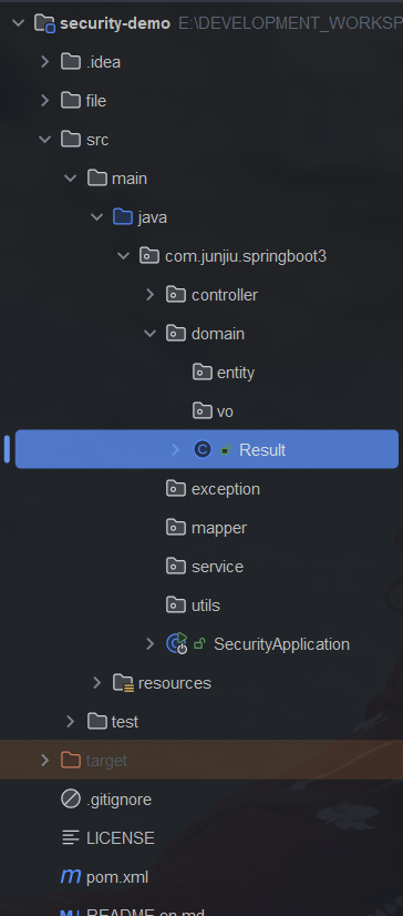 domain中新建Result实体类 Result实体类内容如下: