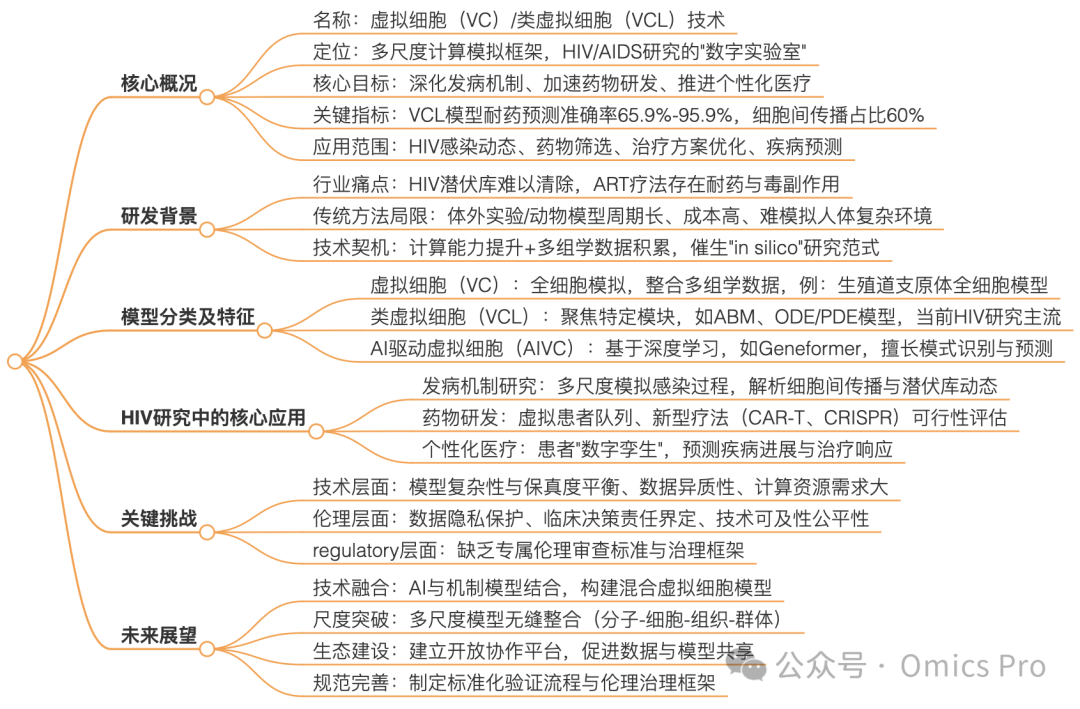 虚拟细胞(VC)技术作为系统生物学与计算生物学交叉领域的前沿方向,旨在通过计算机模型精准模拟细胞生物学行为。本文系统探讨了虚拟细胞技术在人类免疫缺陷病毒综合征(AIDS)研究中的潜在应用、当前核心挑战及未来发展方向。通过回顾现有文献与研究成果,发现:尽管「虚拟细胞」这一术语尚未在人类免疫缺陷病毒(HIV)研究中得到广泛标准化应用,但其核心概念------通过多尺度、多模态计算模型模拟 HIV 感染、免疫应答及治疗干预过程------已深度扎根于该领域前沿。本文重点分析了「类虚拟细胞(VCL)模型」(如智能体模型、细胞自动机、机制数学模型等)在揭示HIV发病机制、加速药物研发、评估治疗策略及推进个性化精准医疗等方面的潜力。同时,本文探讨了该技术在实际应用中面临的技术挑战(如模型复杂性与生物保真度的平衡、数据整合与验证标准、计算资源需求),以及数据隐私、临床决策可靠性、监管框架缺口等伦理困境。最后,展望了人工智能(AI)与虚拟细胞模型的融合前景,强调建立标准化验证流程与伦理治理框架的重要性,以推动该技术健康发展,最终为攻克HIV/AIDS作出贡献。