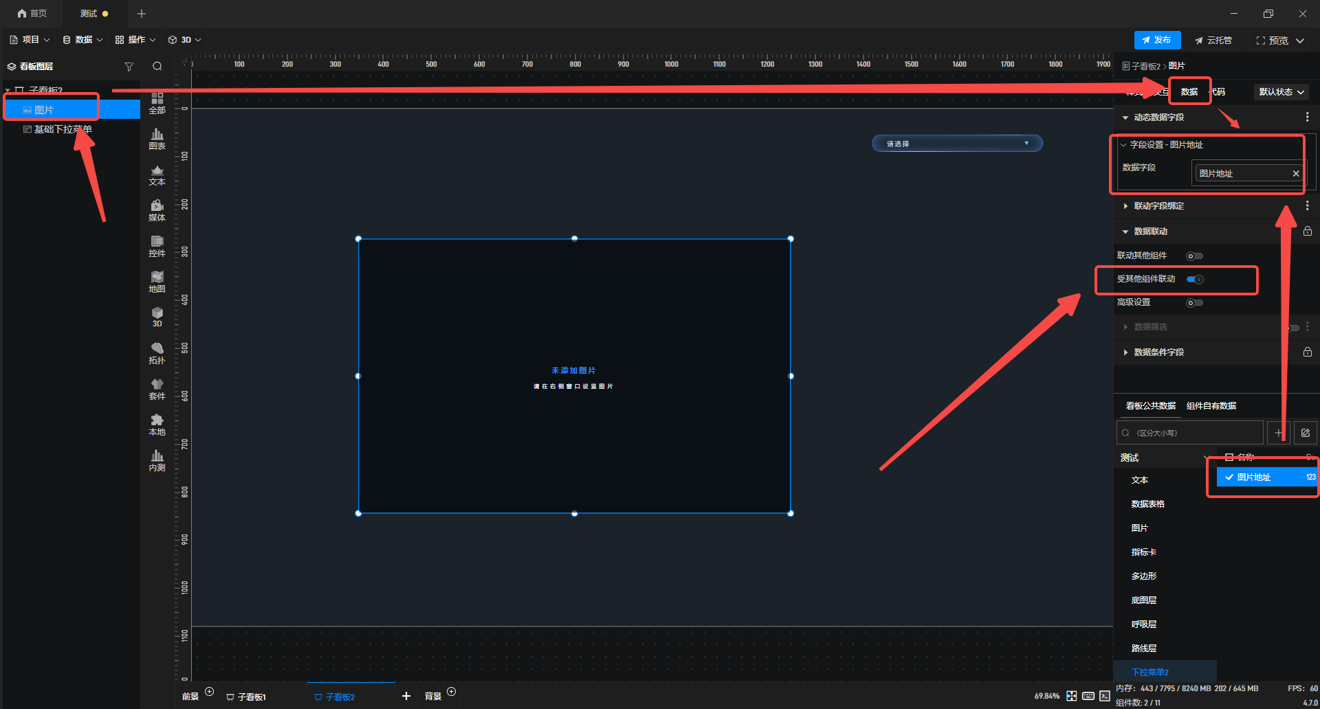 接着选中图片,在**"数据"** 配置栏勾选相应的数据,同时开启**"受其他组件联动"**。