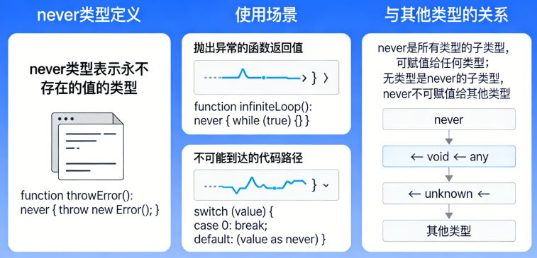 当一个函数永远不会返回正常的值时,它的返回值类型可以被定义为never。例如,一个总是抛出异常的函数: