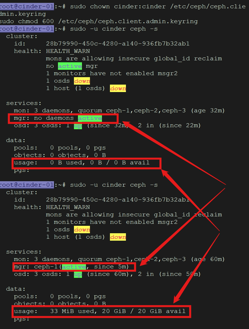 * 保持 ceph.client.admin.keyring的默认权限即可(root:root),因为 cinder-api和 cinder-scheduler服务通常以 root 身份运行,只需要读取集群状态。