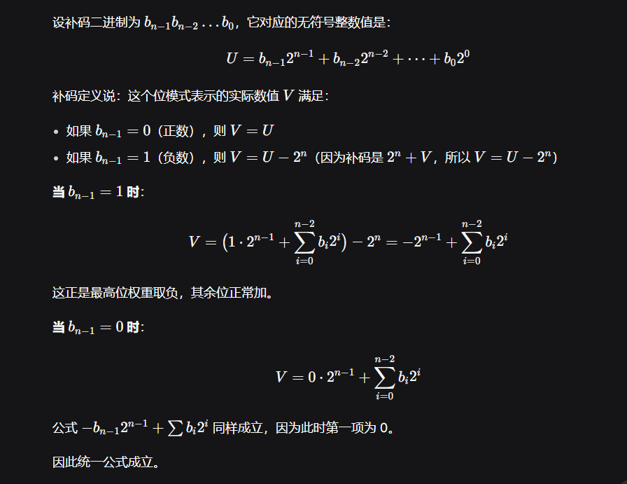 | 5 | 补码转十进制 | 使用公式:V=−bn−1×2n−1+∑i=0n−2bi×2i。符号位的权重是负的。 |