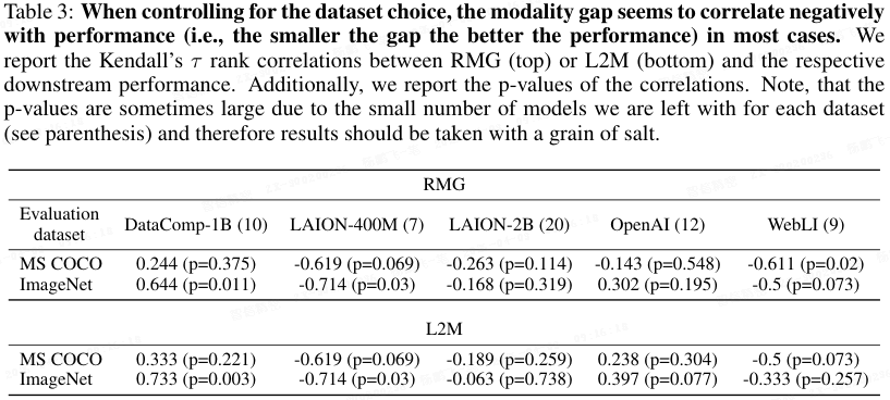 然而,这种表面上的正相关并不意味着 "更大的模态鸿沟更好"。Schrodi 等人进一步控制混淆因素后发现,模型规模和嵌入维度等变量对性能的影响,远大于模态鸿沟(表 1 )。当按预训练数据集进行分组分析后,他们观察到模态鸿沟与性能之间的负相关趋势------即模态鸿沟越小,性能往往越好(表 3)。