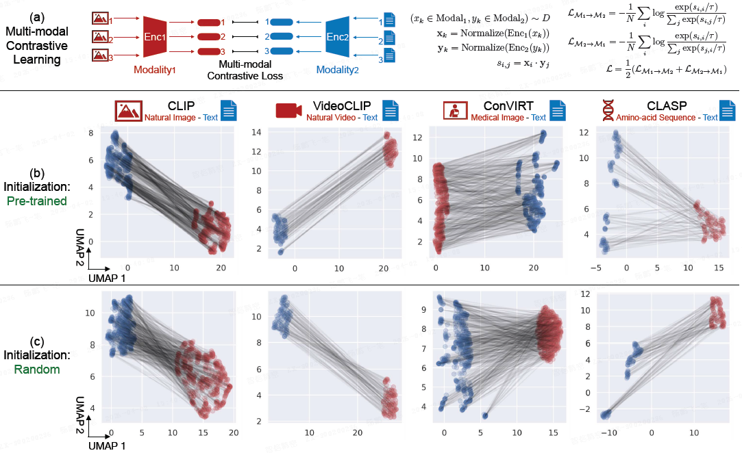 更值得关注的是,这一现象并非 CLIP 独有。Liang 等人的实验表明,无论输入数据是自然图像、医学影像、氨基酸序列还是视频,无论编码器架构是 ResNet 还是 Vision Transformer,模态鸿沟都普遍存在(如上图所示)。更有趣的是,即使使用随机初始化的模型(未经任何训练),这一现象依然可以观察到。