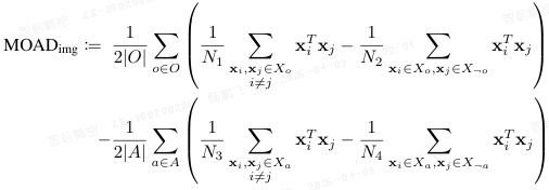 MOAD 的核心思想是:比较模型对 "相同物体" 的图像(或文本)之间的相似度,与 "相同属性" 的图像之间的相似度。如果前者显著大于后者,说明模型在表示中更重视物体信息,MOAD 为正(偏向物体);反之则为负(偏向属性)。