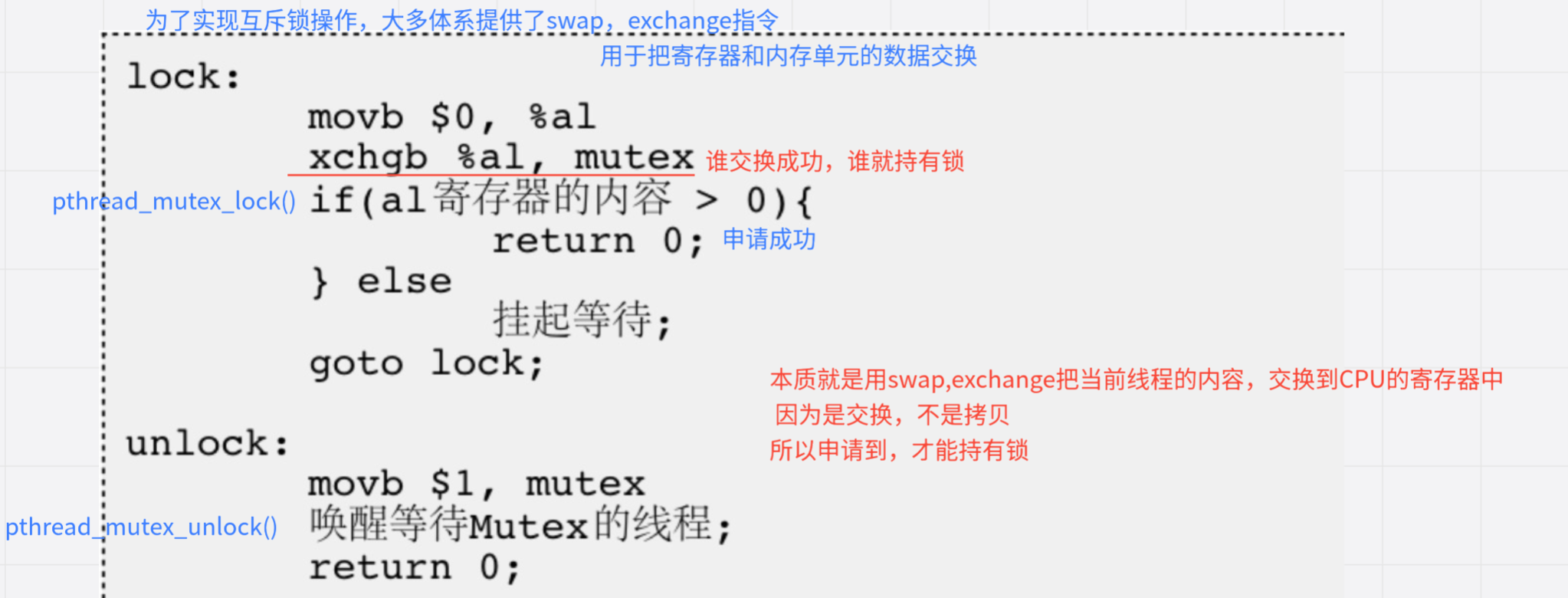 为了实现互斥锁操作,大多数体系结构都提供了swap或exchange指令,该指令的作用是把寄存器和 内存单元的数据相交换,由于只有一条指令,保证了原子性,即使是多处理器平台,访问内存的总线周 期也有先后,一个处理器上的交换指令执行时另一个处理器的交换指令只能等待总线周期