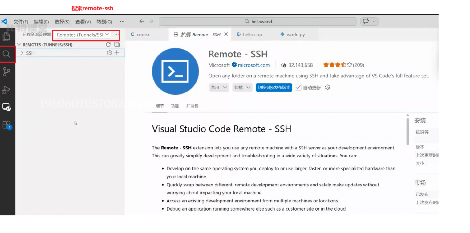 **(1)**搜索插件Remote-SSH插件,安装(vscode中)