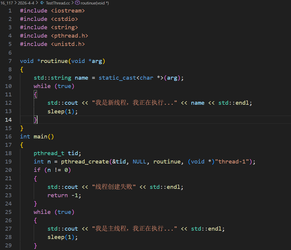 我们也可以用C语言,但是不推荐,有更好的C++写法,无论是 C 语言的结构体,还是 C++ 的类对象,都可以通过传递地址的方式传给线程,结构体可直接传结构体变量的地址,在线程中强转回结构体指针即可访问成员。类对象可传对象地址(需保证对象存活),或传动态分配的对象指针,线程中强转回类指针调用成员方法,这是多线程中传递复杂任务参数的常用方式。