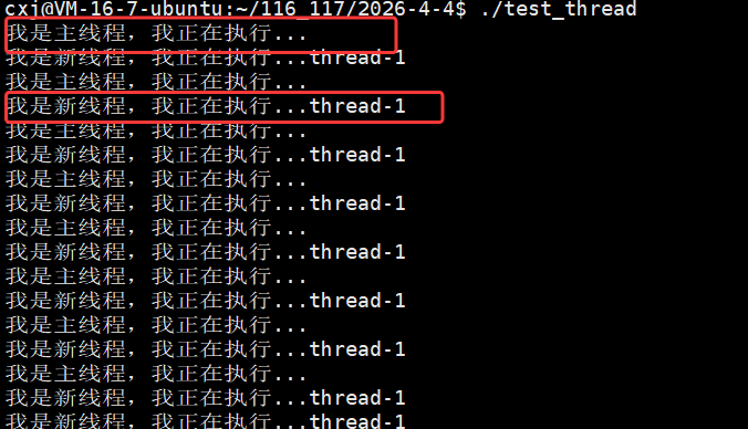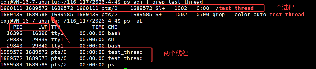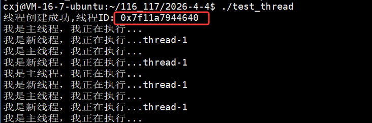 运行结果显示每个线程的 pthread_t 用户态 ID(tid)数值不同,但对应的内核态 LWP(pid)数值完全一致(均为 1707534),这印证了 Linux 中 "一个用户态线程对应一个内核轻量级进程" 的模型,用户态 tid 用于线程库管理,内核态 LWP 用于系统调度,二者高度统一但数值体系独立。