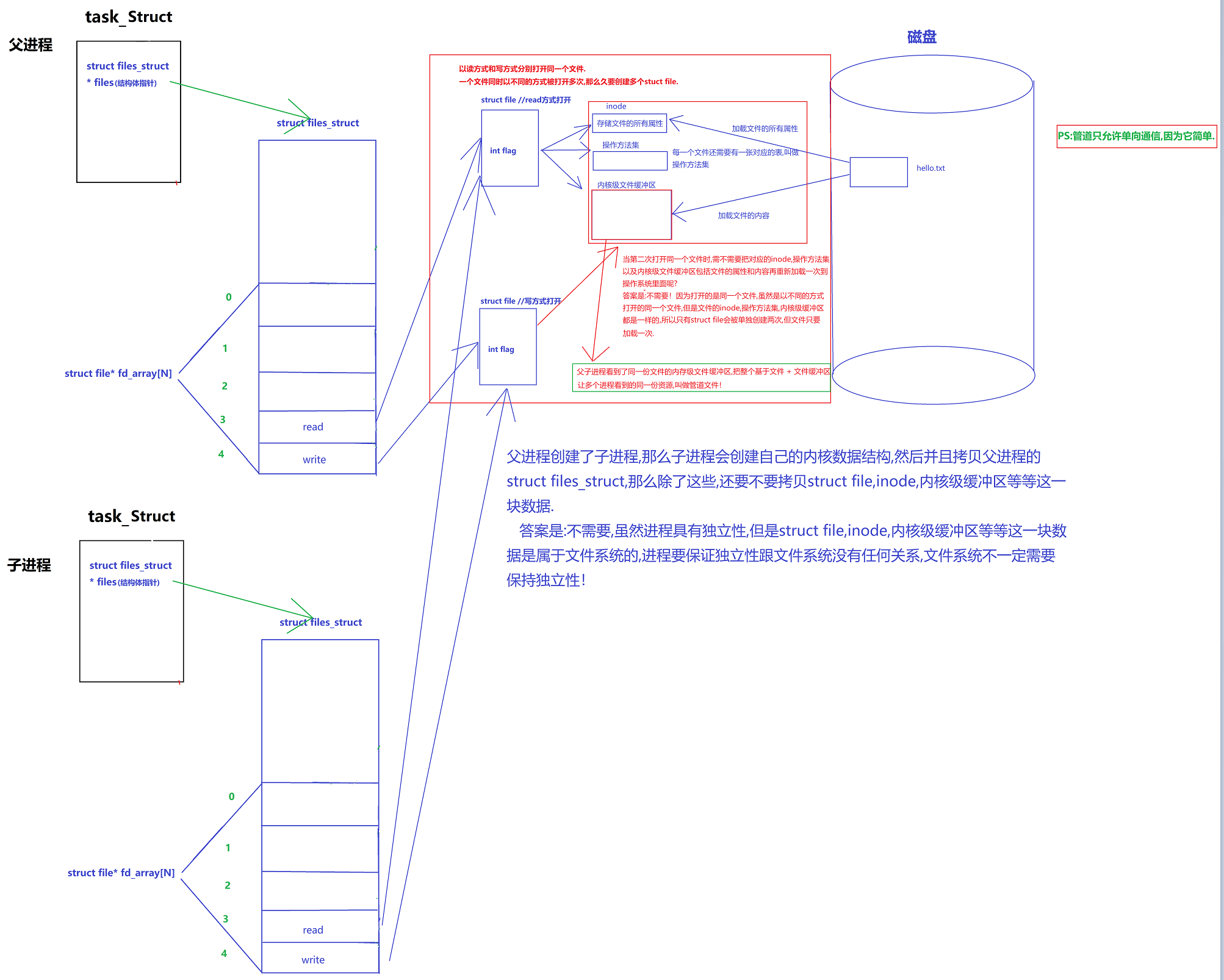 - 然后父进程创建了一个子进程,那么子进程就会创建自己的内核数据结构,并且拷贝父进程的struct files_struct,那么除了这些,还要不要拷贝struct file,inode,内核级缓冲区等等这一块数据.