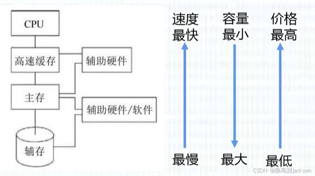- 辅存:解决了主存(内存)容量不够的问题。