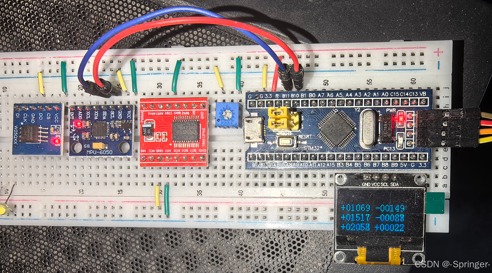 MPU_6050_Init();while (1) { MPU6050_GetData(&AX, &AY, &AZ, &GX, &GY, &GZ); OLED_ShowSignedNum(2, 1, AX, 5); OLED_ShowSignedNum(3, 1, AY, 5); OLED_ShowSignedNum(4, 1, AZ, 5); OLED_ShowSignedNum(2, 8, GX, 5); OLED_ShowSignedNum(3, 8, GY, 5); OLED_ShowSignedNum(4, 8, GZ, 5); }}