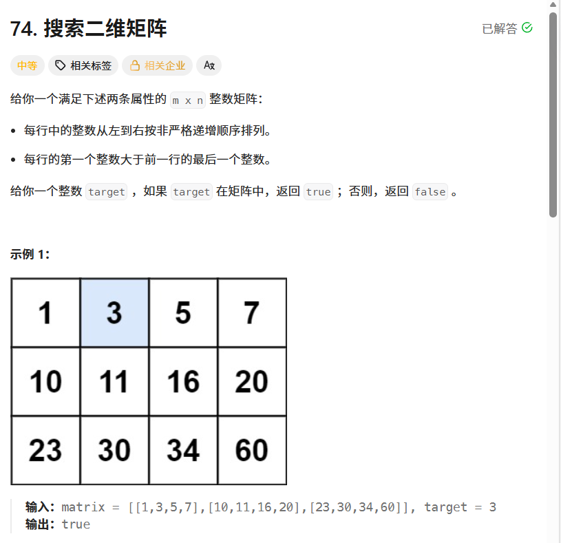 这两个条件连在一起说明什么?说明如果你把这个矩阵像贪吃蛇一样拉直 ,它完完全全就是一个完美的升序一维数组!既然它本质是个一维有序数组,我们为什么不直接对"整个矩阵"做一次二分查找呢?