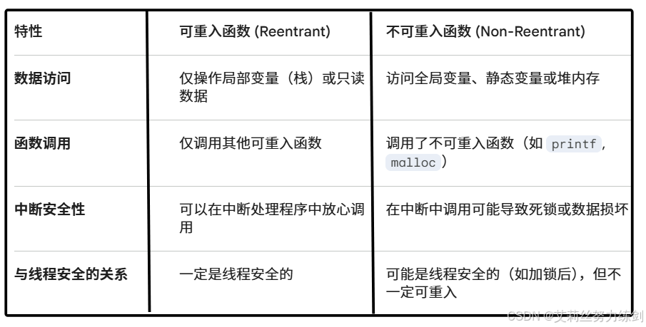 可重入函数:即使被中断并在中断处理程序中再次调用,返回后原调用逻辑依然正确。