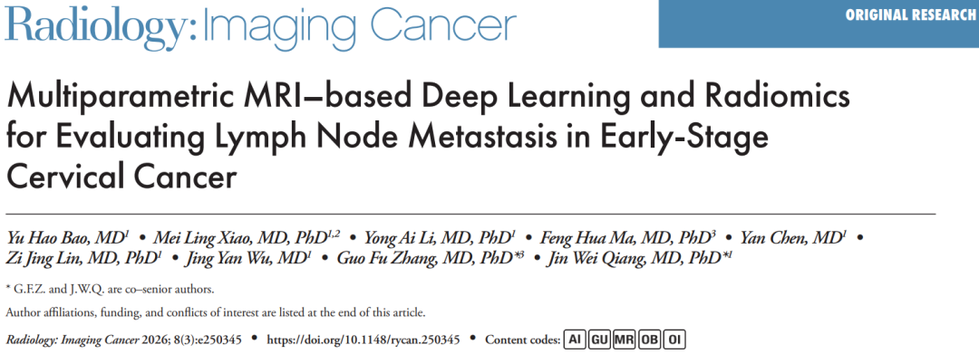 参考文献:Bao YH, Xiao ML, Li YA, Ma FH, Chen Y, Lin ZJ, Wu JY, Zhang GF, Qiang JW. Multiparametric MRI-based Deep Learning and Radiomics for Evaluating Lymph Node Metastasis in Early-Stage Cervical Cancer. Radiol Imaging Cancer. 2026 May;8(3):e250345. doi: 10.1148/rycan.250345.