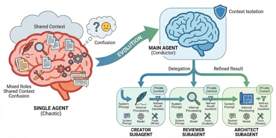 就像一个人要同时处理项目规划、数据调研、数学计算、文案撰写一堆事,不仅容易顾此失彼,还会被海量信息淹没 ------ 智能体也一样,面对太多工具要选、太多上下文要记,它的 "思考空间" 根本不够用,决策效率和准确性都会明显下滑。更别说有些任务横跨好几个专业领域,指望一个智能体精通所有,就像让一个医生同时当好工程师,显然不现实。