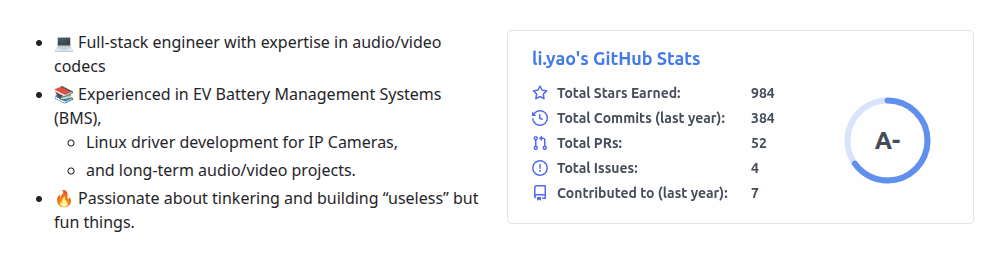 GitHub 将自动为你生成并更新统计卡片,避免了公共服务的限制。