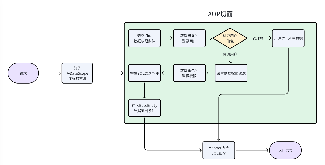 - 通过实现AOP编程,对目标方法进行拦截(标注DataScope 注解的方法),实现了构建数据范围SQL过滤条件