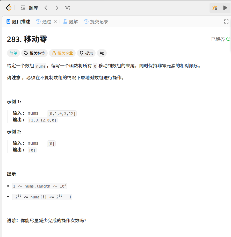 核心是对数组元素进行分类,分了两大类,在遍历元素进行处理的时候需要第一个cur指针,用来区分已处理和未处理的元素;而另一个des指针则是用于区分已处理的元素中分属地两类