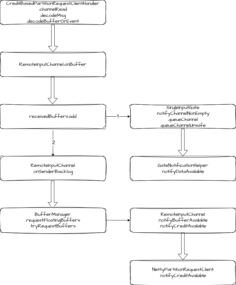一种是 LocalBufferPool 回收空闲 buffer 时,会将 buffer 分配给申请者,分配之后会调用对应 InputChannel 的 notifyBufferAvailable 方法通知更新 Credit。