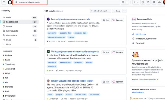 小tips: 搜索时添加"awesome" ,可以更快找到高质量资源汇总仓库,图中以「awesome-claude-code」为例子