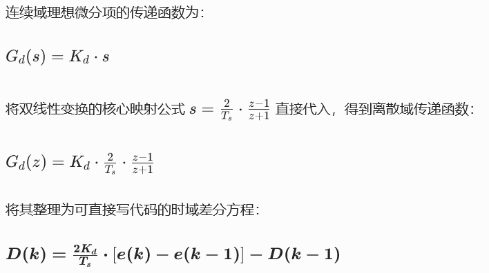 | 双线性变换 | 用「梯形面积」近似积分 | I(k)=I(k−1)+(e(k)+e(k−1))⋅Ts/2 | 二阶精度,误差小 1 个数量级 |
