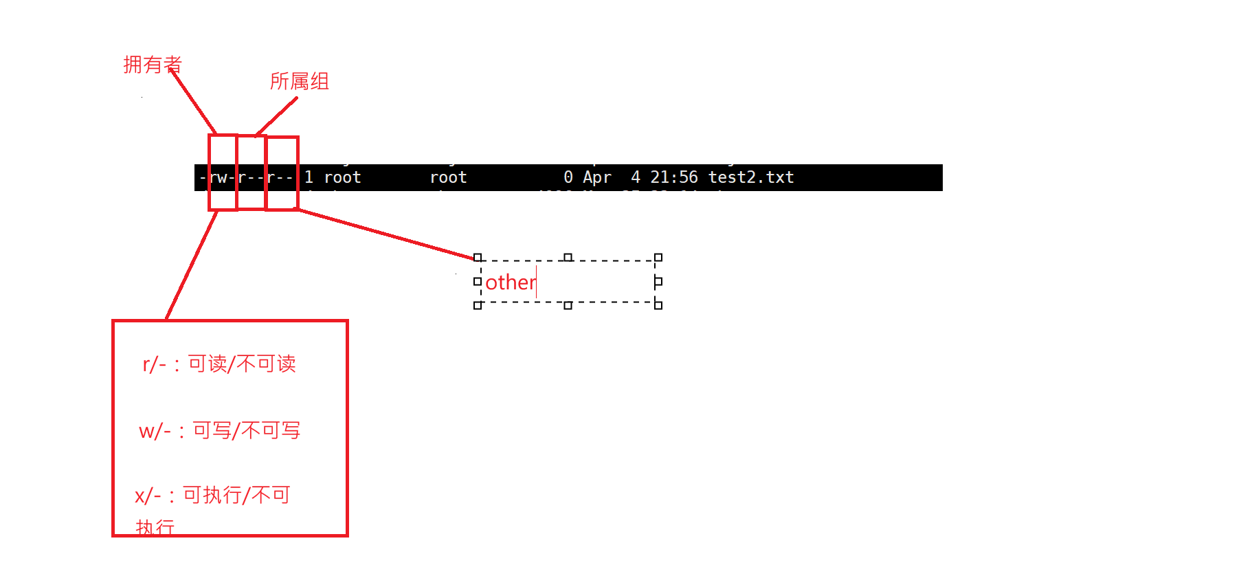 如果前两步都没匹配上,系统直接将用户归类为「其他用户(other)」,使用「其他用户权限(o 的 rwx)」校验操作。