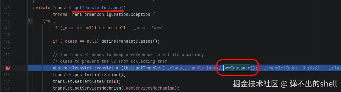 最终到 getTransletInstance 里的 newInstance 实例化对象,触发构造方法执行 RCE: