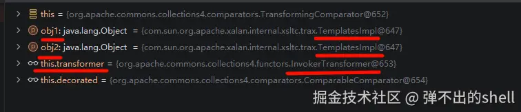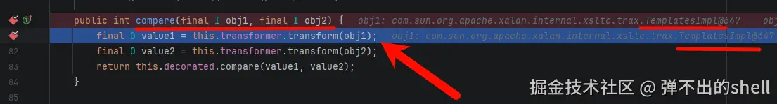 compare 里传入两个 TemplatesImpl 对象触发,此时 transformer 已经是被反射替换过的 InvokerTransformer: