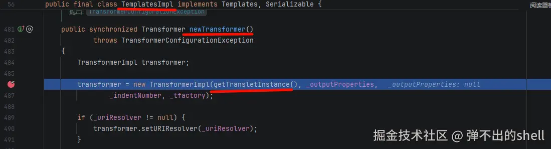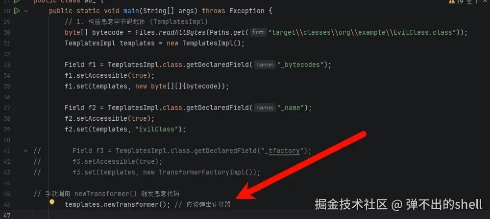 调用 newTransformer() 会触发 getTransletInstance() → defineTransletClasses() → 加载 _bytecodes 里的字节码并实例化,恶意代码在静态块或构造方法里就会执行。