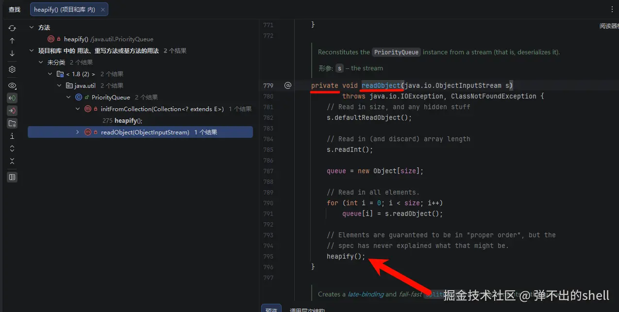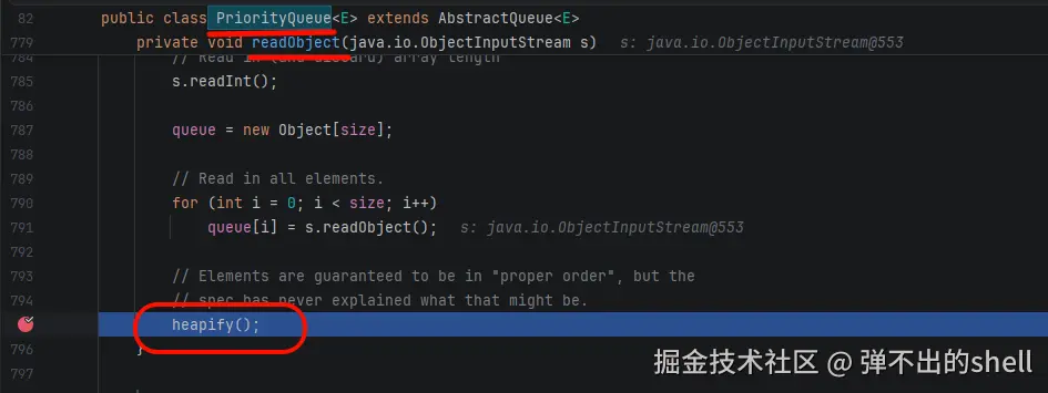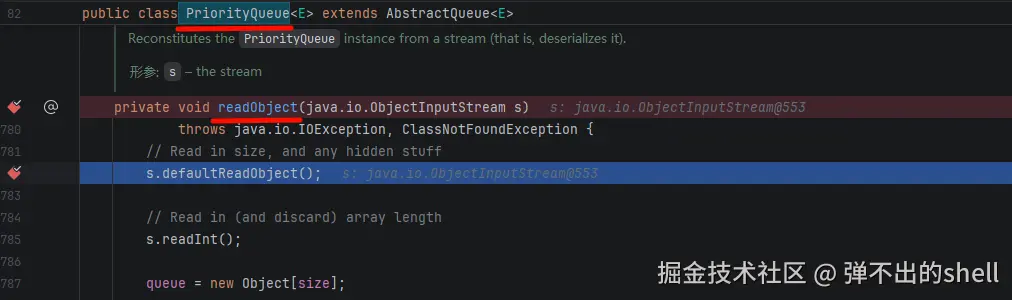 自动触发我们对象(PriorityQueue)的 readObject 方法: