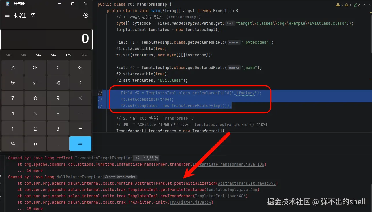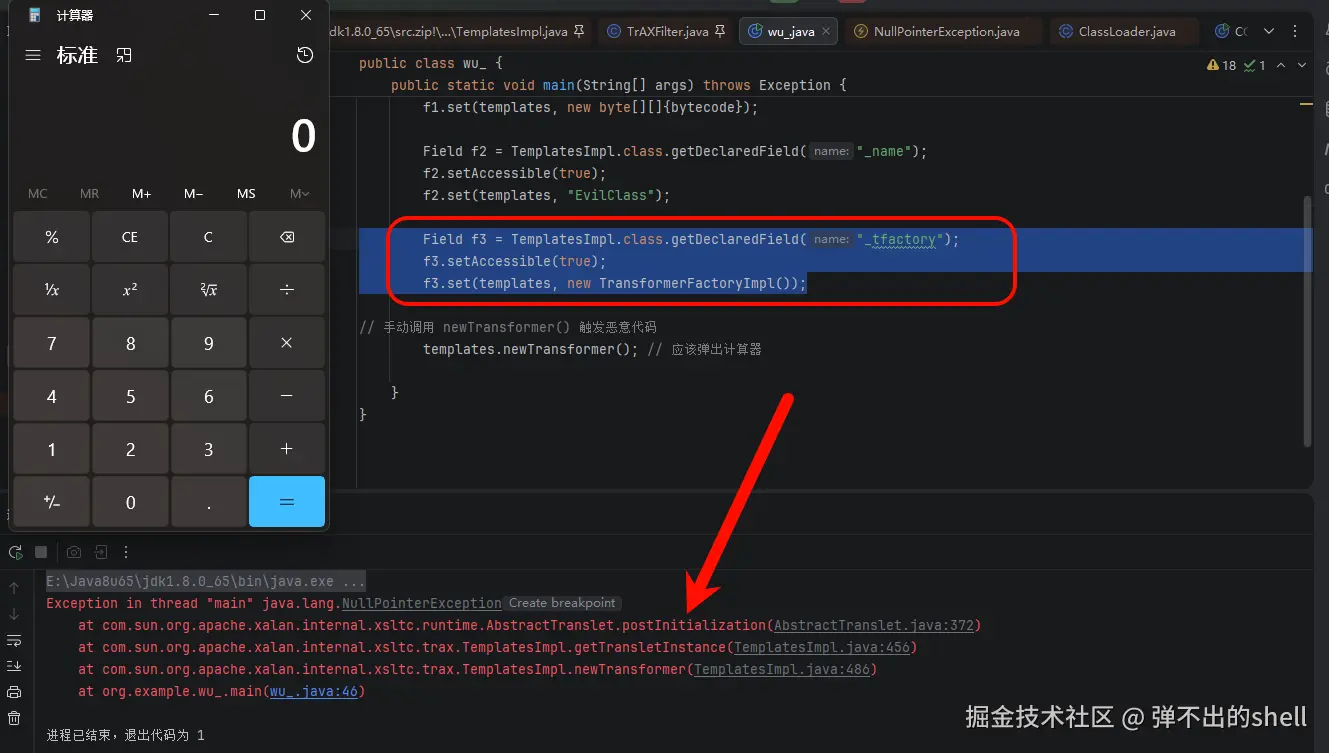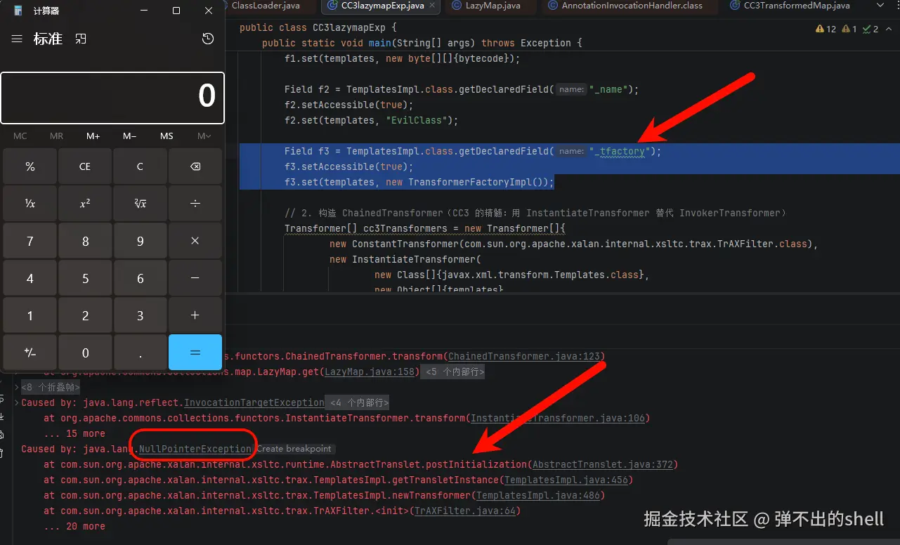 虽然还有 NPE 报错,但位置不在 defineTransletClasses 里了------这些报错都是字节码加载完之后的事,payload 已经正常执行,计算器弹出。