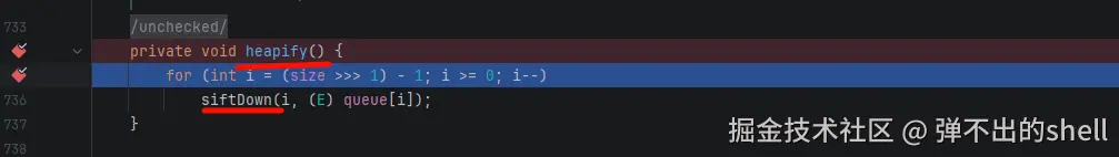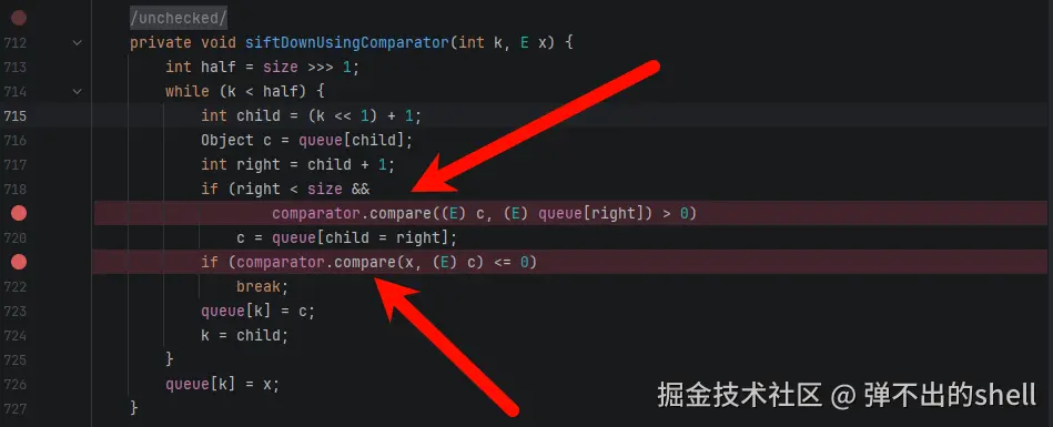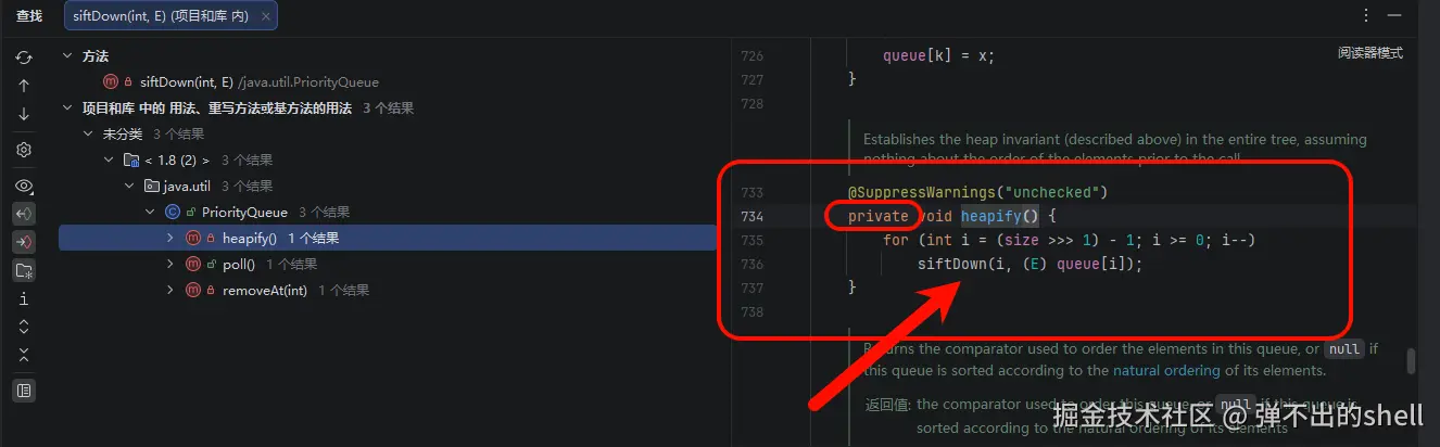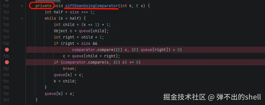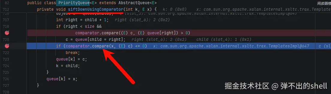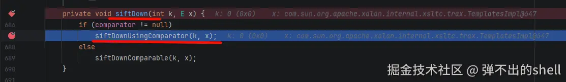 siftDownUsingComparator才会被调用(size=1 时half=0,while 循环直接不进) _tfactory不需要手动反射设置------反序列化时TemplatesImpl.readObject()会自动初始化;transient修饰导致手动赋值在序列化时也会丢失