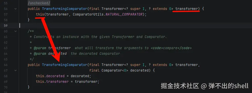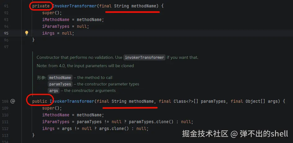 InvokerTransformer 有两个构造方法,参数不一样。第一个是私有的,用第二个。如果两个都是私有的,就需要用反射拿到私有构造方法再调用(如果这样就又会出现新问题,不会自动触发):