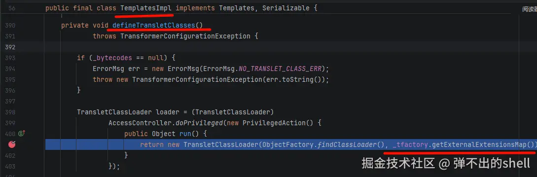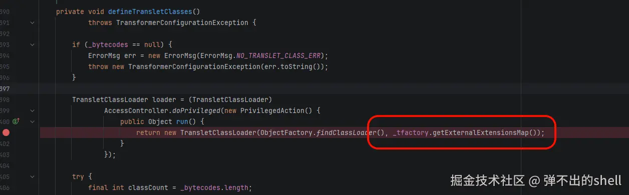 之前的文章判断是说 defineTransletClasses 函数里有 _tfactory.getExternalExtensionsMap() 的调用,所以 _tfactory 必须赋值。