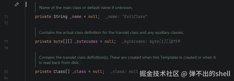 这个在 CC3 里分析过了,简单过一下。TemplatesImpl 里面有三个关键字段:_bytecodes(恶意字节码数组)、_name(不能为 null)和 _tfactory。