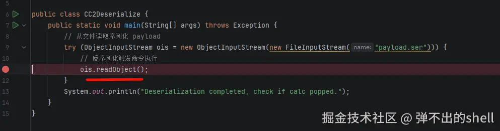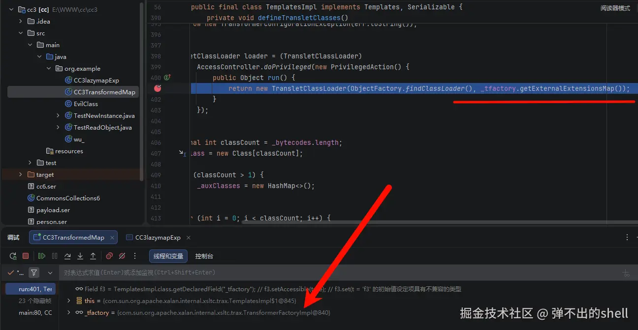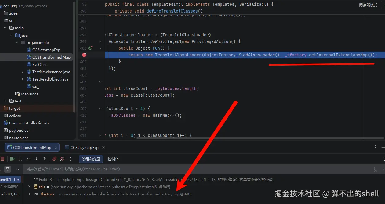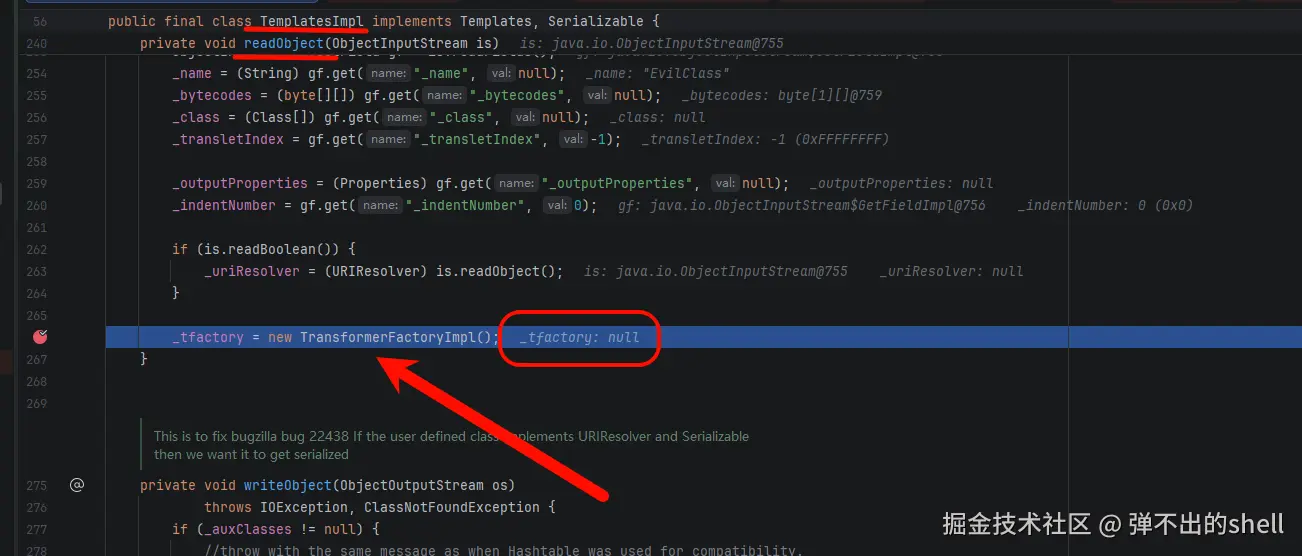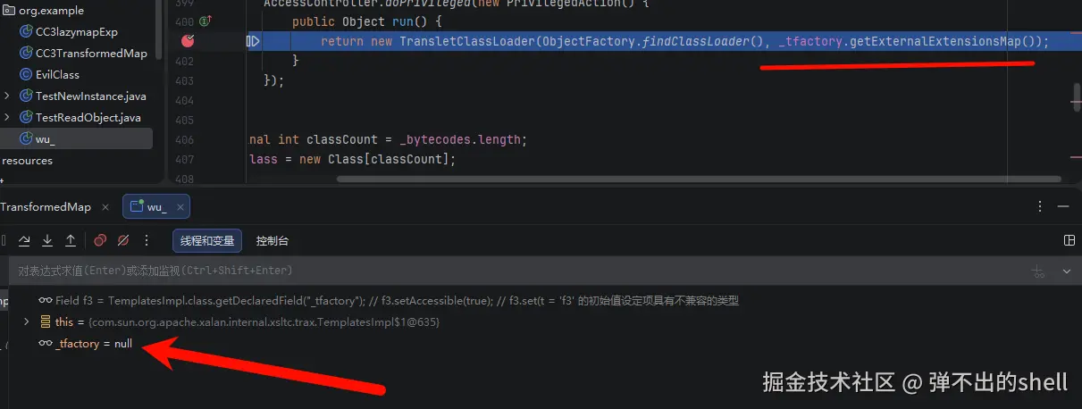 经过调试进一步发现,不管我们有没有手动给 _tfactory 赋值,进入反序列化流程之后 _tfactory 显示的都是 null------这是因为反序列化不仅会触发最外层对象的 readObject,链里面每个对象如果有 readObject 方法,也都会被自动调用。TemplatesImpl 自己的 readObject 里会重新初始化 _tfactory,所以手动赋值根本没用。