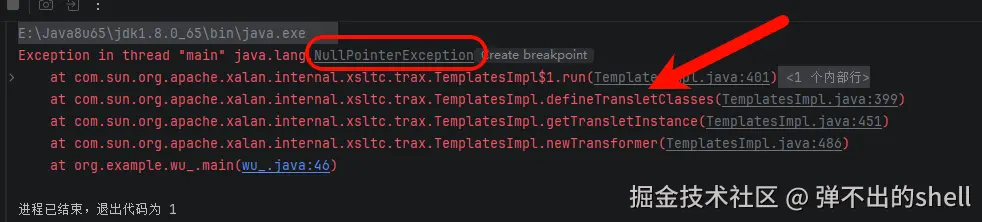 把 _tfactory 赋值注释掉之后,得到的是 NullPointerException(NPE),错误出现在 defineTransletClasses 函数里的 _tfactory.getExternalExtensionsMap() 这里,字节码还没开始加载链就断了。